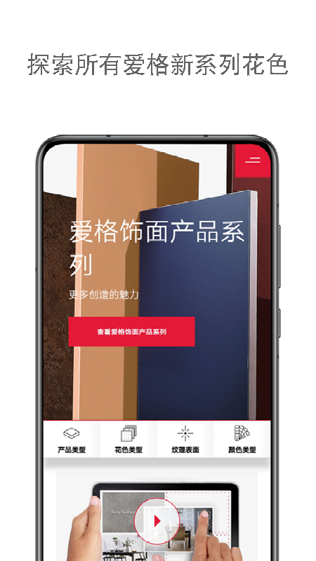 您可以在 EGGER App 上浏览全新的爱格饰面产品系列 2017-2019 的全部花色以及现有地板系列的全部花色。 \\r