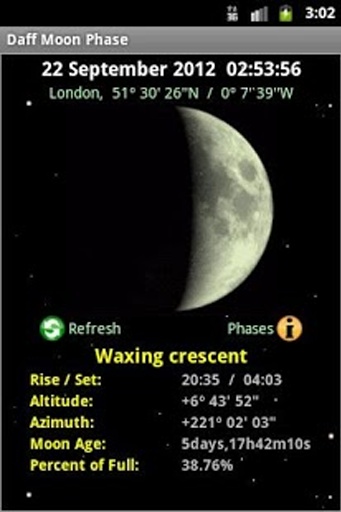 This simple freeware program displays Moon and Sun real-time information:- Moon phases,- Moon age,- Moon/Sun rise/set times,- Current Moon/Sun altitude and azimuth,- Day-length.All this data is calculated based on user\'s location (geographic coordinates) and a specified point in time.This application is totally FREE and contains NO advertisements, NO spyware or any other annoyances!This application is totally FREE and contains NO advertisements, NO spyware or any other annoyances!