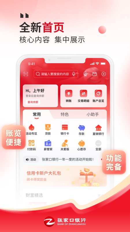 2.首页:打造自定义专属首页,主要涵盖扫一扫、收支明细、转账、账户总览、贷款、存款、薪管家等业务模块,为客户提供我行业务资讯及最新活动动态,提高业务处理效率,掌上操作更便捷、更贴心。