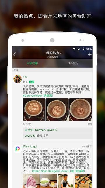 已开放城市:香港、澳门、台北、曼谷、吉隆坡、槟城。 iPick 是个免费的社交美食 App,旨在给你提供你全城最好的美食信息。你可以通过你的朋友和值得信任的食评家在 iPick 分享的经验,找到你喜爱的地道美食。iPick 拥有时髦的界面,丰富且易用的功能,还没有广告!你可以使用智能搜索迅速定位你喜爱的餐厅,查看别人对餐厅的评价,发表你对餐厅和美食的看法并分享到 WeChat 或 Facebook,还可以在足迹页与好友互动,掌握好友最新美食动向。你还在等什么?快下载 iPick,开启你的美食之旅吧! iPick 主要特色:美食足迹:分享你的美食经历,查看和评论好友的美食足迹,与好友互动美食视频:快来拍摄比图片更生动的短视频,记录下食物转瞬即逝的美妙瞬间,传递你最珍贵的美食体验智能搜索:精准易用的搜索功能,是你寻找心仪餐厅的最佳拍档美食推荐:每周提供最新鲜热辣的餐厅优惠和应季美食等信息精选食评:提供大量的专业食评文章供你参考,让你不再为去哪里吃而烦恼零广告:无任何广告,无干扰,让你专心浏览餐厅资料和美食信息 使用说明:使用 iPick 前,建议打开定位并允许 iPick 使用你目前的位置,以便准确地推送餐厅以及优惠信息。