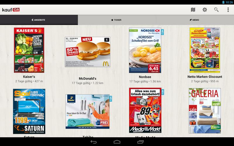 Die kaufDA Navigator - AppBequem Prospekte auf dem Handy blättern: wie in Echt - aber umweltschonend!Finden Sie schnell & bequem die neuesten Prospekte, Angebote & Coupons sowie Öffnungszeiten von Geschäften in Ihrer Nähe.Lassen Sie sich als Erster über neue Prospekte & Angebote von z.B. Media Markt, Saturn, Aldi, Netto, Kaisers und Real bis zu kik, McDonald\'s, Tchibo, OBI und vielen weiteren Handelsunternehmen informieren.Egal ob Berlin, Hamburg, München, Köln oder Frankfurt: Mit dem kaufDA Navigator für Android® finden Sie in ganz Deutschland immer die aktuellsten Angebote um die Ecke.Jetzt App herunterladen & Umwelt schonen!Die Funktionen im Kurzüberblick ----------------------------------------------✓ Blättern Sie bequem in Prospekten von Geschäften aus Ihrer Umgebung✓ Finden Sie Adressen, Öffnungszeiten und Telefonnummern von über 220.000 Geschäften✓ Suchen Sie nicht nur nach Prospekten sondern auch nach einzelnen Produkten✓ Lassen Sie sich automatisch bei neuen Angeboten ihrer Favoriten benachrichtigen✓ Speichern Sie einzelne Prospektseiten und lassen Sie sich vor Ablauf der Angebote benachrichtigen✓ Erstellen Sie Einkaufslisten✓ Videos schauen und detaillierte Produktinformationen abrufenBekannt aus den Medien----------------------------------------------BILD: „Die besten Extra-Programme für mein Handy“COMPUTERBILD: „Schnäppchenfinder“B.Z. BERLINS GRÖSSTE ZEITUNG: „Mit dieser App zahlen Sie nie wieder zu viel.“LAURA: „Die besten Internetseiten für Frauen. Mit kaufDA.de durchstöbern Sie online lokale Angebotsprospekte von Super- bis Baumärkten.“CHIP: „Sehr nützliches Tool, dass durch die große Anzahl an teilnehmen Geschäften auch außerhalb von Ballungszentren einwandfrei funktioniert.“-----------------------------------------------------Ausschnitt unserer Händlervielfalt:DISCOUNTER: Aldi, Netto Marken-Discount, NP-Discount ... Supermarkt & Getränke: Edeka, Real, Tchibo, Kaiser\'s, Getränke Hoffmann ... BIO: BioMarkt, Bio Company TECHNIK: MediaMarkt, Saturn, ProMarkt, Expert, MediMax, EuronicsDROGERIE: Nivea,...MODE: kik, C&A, Ernsting´s Family, Peek & Cloppenburg,... EINRICHTUNG: Höffner, Sconto, Rahaus, Möbel Kraft BAUMARKT: Praktiker, Obi, Hornbach ... FASTFOOD: McDonald\'s,...Städte:Berlin, Hamburg, München, Köln, Frankfurt, Essen, Dortmund, Stuttgart, Düsseldorf, Bremen, Hannover, Duisburg, Leipzig, Nürnberg, Dresden, Bochum, Wuppertal, Bielefeld, Mannheim, Bonn, uvm.Wir wünschen Ihnen nun viel Erfolg mit dem kaufDA Navigator! Schreiben Sie uns Ihre Meinung: android@kaufda.de