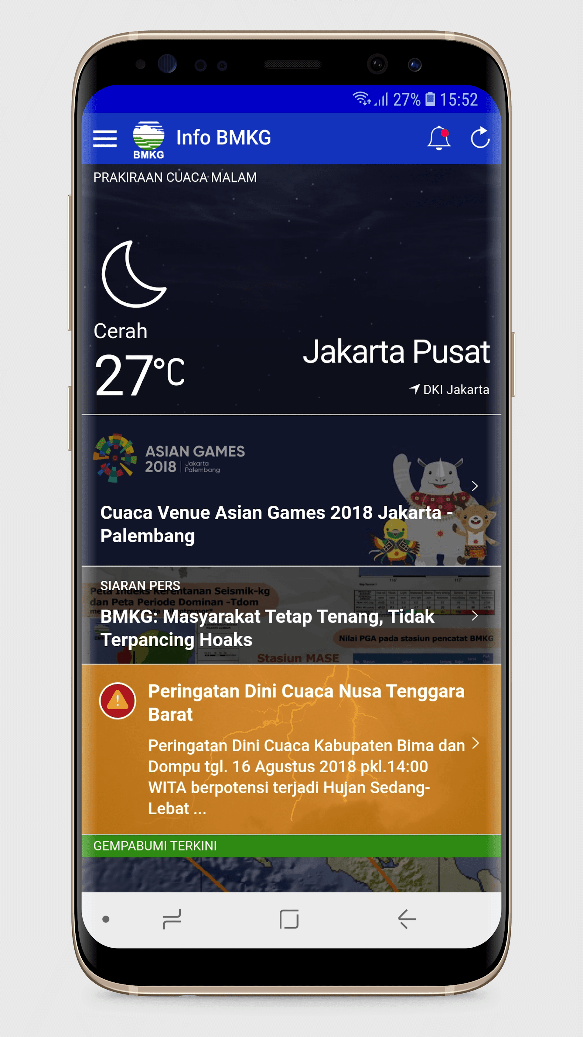 Informasi Cuaca, Iklim, Kualitas Udara, dan Gempabumi yang terjadi di Indonesia. Aplikasi mobile ini resmi dirilis oleh Badan Meteorologi, Klimatologi dan Geofisika (BMKG).