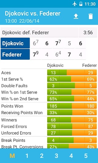 Keep track of the score and statistics of your tennis matches with this easy to use tennis score keeper app. Match statistics are also recorded to assist you in finding weaknesses in your game. \\r