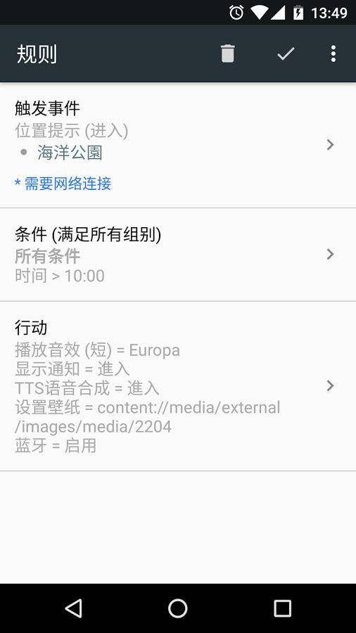 为什么要自动化?这可以节省时间,再不用人手重复无趣的动作。功能这是个自动化助手(基于时间 / 事件驱动)。它包括定位、电话、定时任务、文本到语音服务(TTS)等不同服务的自动化。● 30+ 事件● 30+ 条件● 40+ 动作● 10+ 预定义样本规则核心玩法规则有 3 个部份:事件、条件、行动● 事件触发 查询条件● 满足条件 执行行动