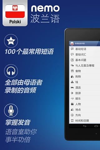Nemo 教您学会最常用语,让您立即说一口自信的波兰语。Nemo 适用于安卓手机和平板电脑,在全球范围内有上百万的下载量。 \\r