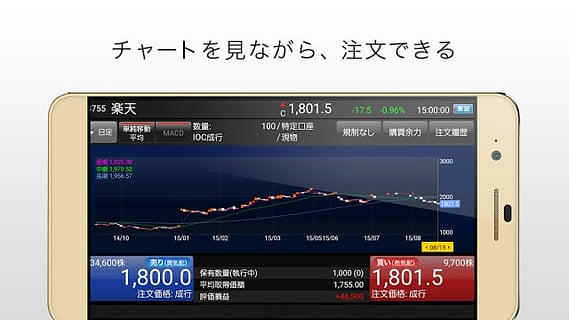 株価をタップするだけで発注できる「エクスプレス注文」。チャート画面への切替えも可能でトレンドを见ながらよりスピーディーに発注することができます。 \\r