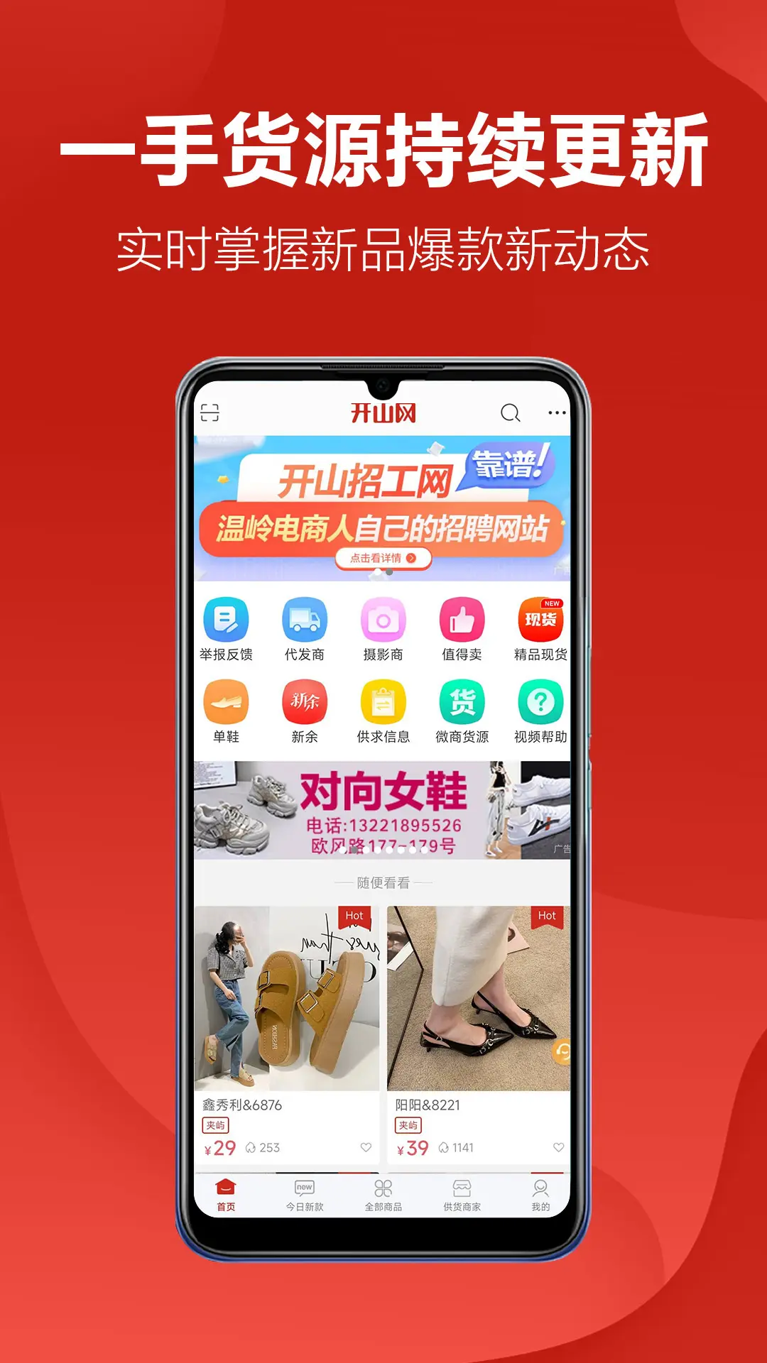 开山网官方 APP,一站找遍全国女鞋货源,国内低价女鞋一手产地货源。可一键发布淘宝阿里微信等渠道,找款搜款商家导航在线下单。