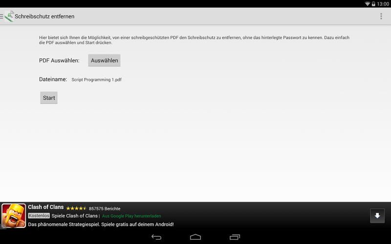 Wer kennt das nicht? Man sitzt in einer Vorlesung, lädt sich das Skript des Dozenten herunter und merkt, dass es per Schreibschutz mit Passwort geschützt ist. Man kann so keine Änderungen per Tablet machen.Abhilfe schafft hier die \\\"PDF Utilities\\\" App. Mit dieser kann man einfach, ohne viel Aufwand die PDF entsperren, sodass Änderungen gemacht werden können.Ein weiteres praktisches Feature ist das Entfernen von PDF-Seiten, um beim Drucken später nicht die Seiten angeben zu müssen, die gedruckt werden sollen (was oft sehr mühselig ist).Eine neue Funktion ist das Hinzufügen von leeren Seiten in eine existierende PDF-Datei. Dies ist praktisch für zusätzliche Notizen, falls der Platz auf einer Seite nicht ausreicht.Und das alles, ohne die PDF Datei an einen Webservice zu senden, sie bleibt auf dem Gerät.Jetzt auch mit Dropbox-Support. Dateien aus der Cloud direkt verarbeiten, ohne diese manuell herunterladen zu müssenFunktionen: * Entfernen des Schreibschutzes einer PDF-Datei (ohne das Passwort zu kennen) --> PDF Unlock * Entfernen der Verschlüsselung einer PDF-Datei (das Passwort muss bekannt sein, da die Datei verschlüsselt ist) * Entfernen ausgewählter Seiten einer PDF-Datei * Hinzufügen leerer Seiten zu einer PDF-DateiWICHTIG: Aufgrund von Limitation bei der Beschreibung von externen Speichern, die neu in Android 4.4 eingeführt wurden (betrifft vor allem die Samsung Galaxy Geräte), ist es aktuell nicht möglich, PDF-Dateien von externen SD Karten zu verarbeiten. Wenn ein Workaround exisitert, wird dieser in den kommenden Versionen umgesetzt. Bitte die PDF-Dateien vorher auf den internen Speicher kopieren.Die FAQ sind hier zu finden: http://www.mdev-germany.de/android-pdf-utilities-deutsch#faq** Wenn Sie Probleme mit der Benutzung der App haben, schreiben Sie mir bitte eine E-Mail an mdev.germany@gmail.com und wir versuchen das Problem gemeinsam zu lösen. Bitte geben Sie nicht gleich eine schlechte Bewertung im Play Store ab.Vielen Dank. **