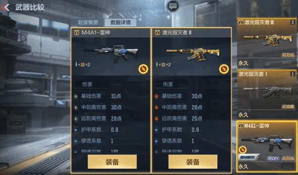 就像开头说的那样,激光毁灭者是在 M4A1 的基础上进行改造的,所以它的武器数据基本上都是以 M4A1 为模板进行调整的,在原来 M4A1 的基础上着重增加了它在挑战模式中的属性。比如 M4A1 雷神和激光毁灭者Ⅲ在数据方面的差异也仅在于伤害、移速和点射稳定性这三个方面,而激光毁灭者Ⅲ的点射稳定性比雷神还高上一点,综合属性竟然和雷神不分伯仲。