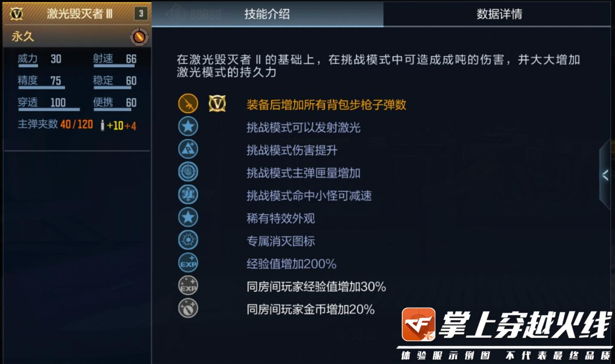 激光毁灭者的武器属性几乎全集中体现在挑战模式中,首先是挑战模式中可以切换到激光形态发射激光,并且在挑战模式下伤害提升、主弹匣量增加;其次在觉醒到激光毁灭者Ⅱ后,还增加了挑战模式命中小怪减速的属性;而觉醒到激光毁灭者Ⅲ后更是觉醒成了与雷神同级别的英雄级 M4,激光模式的持续时间也得到了很大幅度的提高。