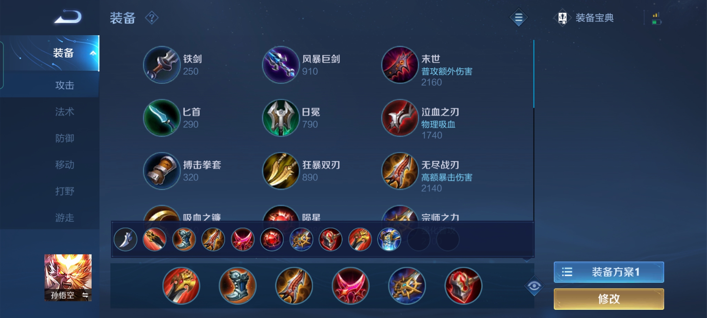红色打野刀,攻速鞋,无尽战刃,影刃,宗师之力,碎星锤。中后期可把攻速鞋换成抵抗之靴减少被控时间获得更多的操作空间,孙悟空在使用技能之后都可以获得强化普通攻击可以出宗师之力配合宗师之力的被动强击打出更大的伤害,后期可以出复活甲然后预购名刀在团战中打出高额的伤害。