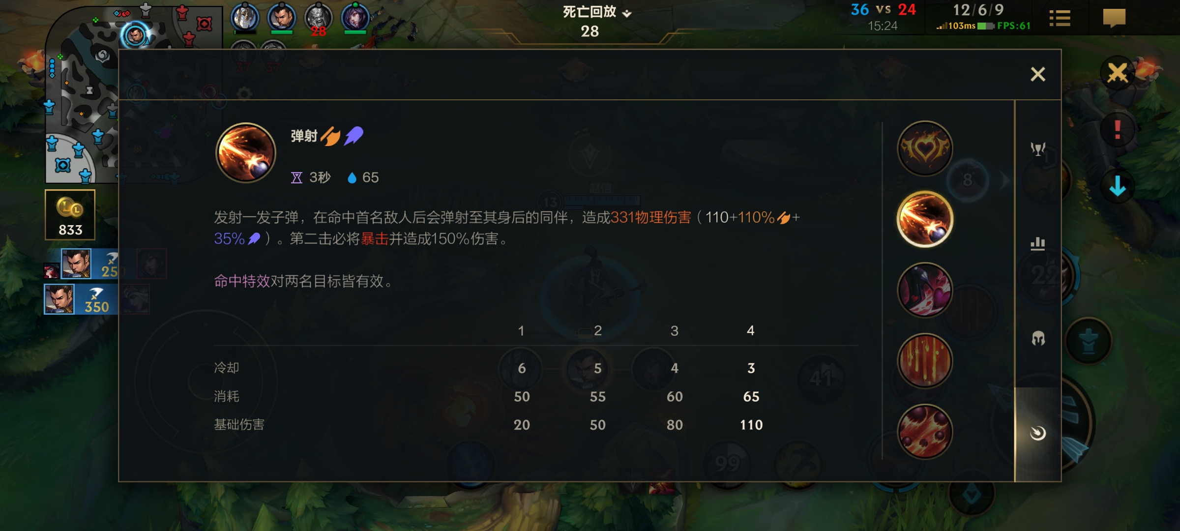 开局对面的辅助一定会站在对面射手面前,我们虽然打不到对面射手,但是利用一技能的弹射能力,通过辅助或者小兵作为跳板,可以进行消耗,一石二鸟,而接下来一枪,我们要伺机而动,瞄准对面射手打出高额的暴击伤害。
