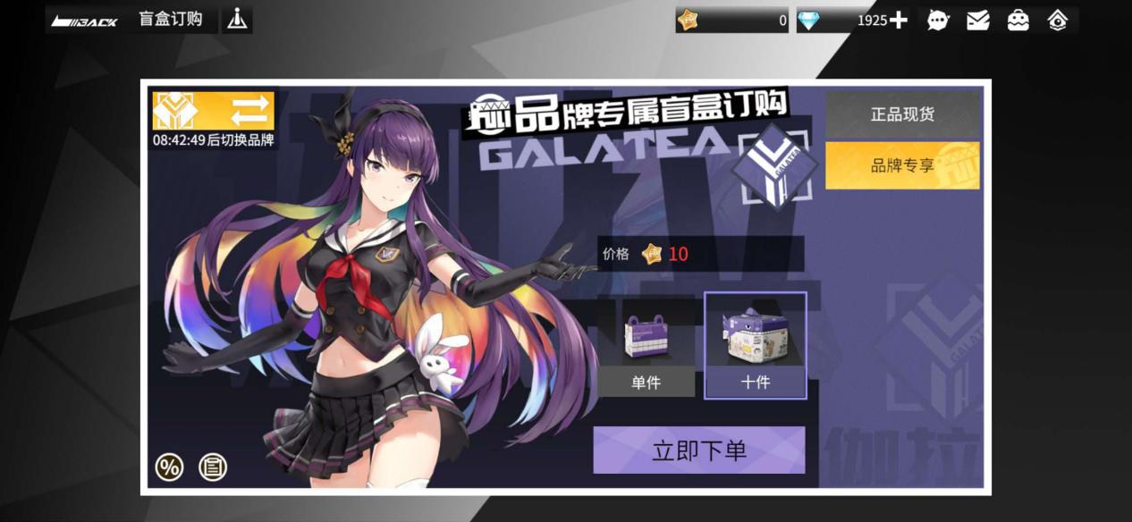 品牌专享盲盒订购界面(界面左上角显示当天的限定品牌,每日轮换,也可点击切换)