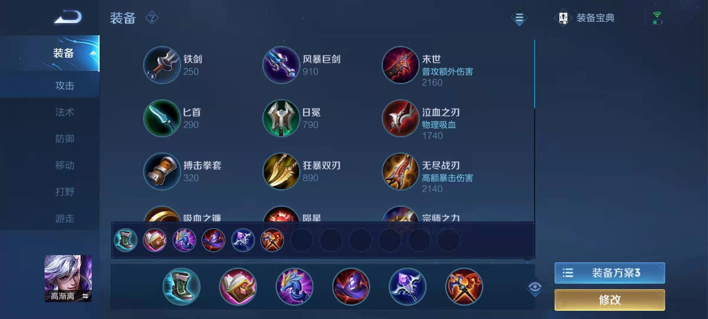 这套也是典型的 88 法穿铭文了。这是个靠法强的英雄,法强越高伤害就越高。回血量也会成正比。这样即使是残血也有可能瞬间回到满血了。还有 4.8%的法术吸血,其实这个属性增益不大。但是缺少了就不行,在前期血书还没做出来的时候可以增加一些续航。大家可以会疑惑,这个移速要他干嘛呢。大家应该知道,高渐离大招开启后会增加移动速度,然后加上鞋子的移速加成在加上铭文的移速加成,那是不是可以当半个闪现用了。那移速除了关羽马超没人能达到,所以追击和逃跑都是非常好用的。非常契合高渐离。攻速也是一个很重要的属性,因为高渐离第三下是一个强化普攻,也是有穿透效果,所以前期清线的话有攻速还是比较快的。