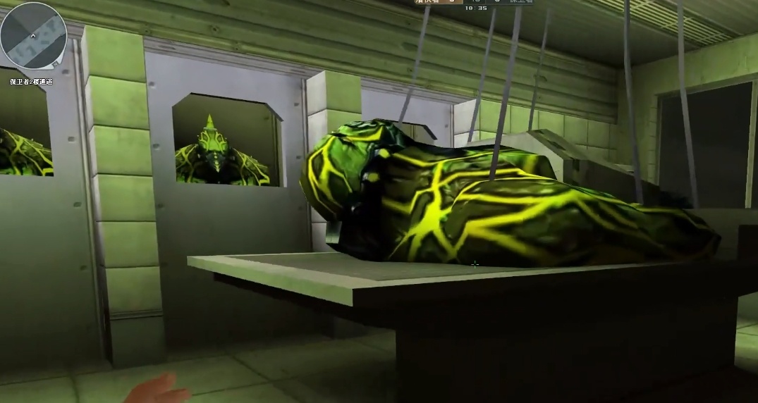 不过,此时绿巨人受到束缚,动弹不得,并且被医生打了麻药(又或是 GG 了),安静的躺在手术台上一动不动。这一幕,只有卡进 bug 里,慢慢潜入实验室才能看到。这张地图刚上线的时候,小编被班里的同学拽着卡 BUG,与绿巨人近距离接触过几次,没想到再次看到手术台上的绿巨人,已经过去了 9 年。