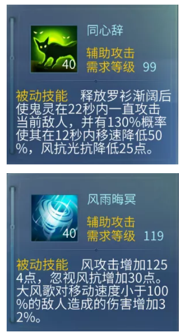 ▷其实这两个调整可以一起看,之前技能的减速效果不是特别明显,调整了之后就不仅是减速了,还有释放罗衫见阔以后鬼灵不会再去乱打其他目标了。至于风雨晦冥产生了一个群体效果,风攻击和忽视风得到了提升,大风歌也别藏着掖着,多拿出来秀一秀。