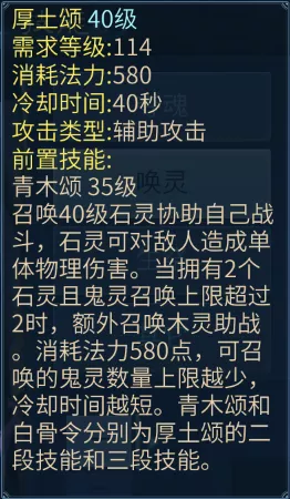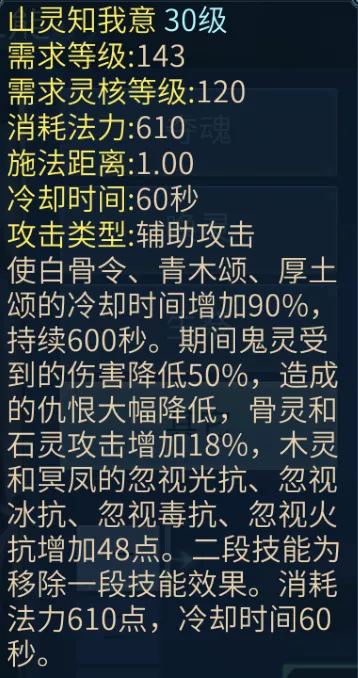 异人师门秘术[山灵知我意]:使白骨令、青木颂、厚土颂的冷却时间增加 90%,持续 600 秒。期间鬼灵受到的伤害降低 50%,造成的仇恨大幅降低,骨灵和石灵攻击增加 18%,木灵和冥凤的忽视光抗、忽视冰抗、忽视毒抗、忽视火抗增加 48 点。二段技能为移除一段技能效果。消耗法力 610 点,冷却时间 60 秒。
